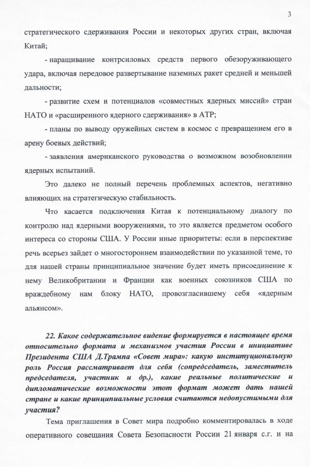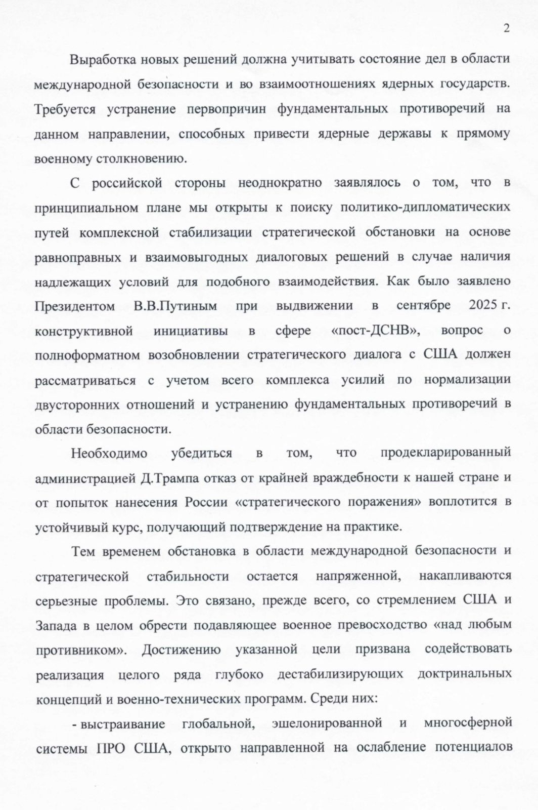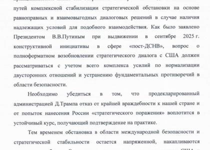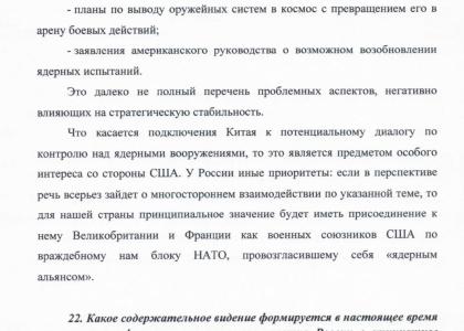 В центре внимания депутата оказались вопросы диалога с США, перспективы стратегической стабильности после истечения срока действия ДСНВ (Договора о стратегических наступательных вооружениях), возможные новые международные форматы, а также официальная позиция России по теме ядерных испытаний.