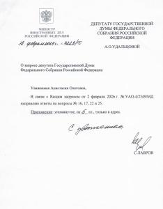 Анастасия Удальцова в своих социальных сетях сообщила о получении подробных ответов от Правительства, в частности — развернутой позиции Министерства иностранных дел РФ. По мнению Анастасии Удальцовой, представленные формулировки предельно четко отражают современную международную повестку и последовательный подход нашей страны к защите своих национальных интересов.