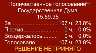 Вопрос был поставлен на голосование. Законопроект набрал 107 голосов (23,8%). Его поддержали фракции КПРФ, «Справедливой России», ЛДПР и «Новые люди», а также четыре депутата фракции «Единая Россия». Однако подавляющее большинство депутатов крупнейшей думской фракции «Единая Россия» (порядка 300) проигнорировало голосование по предложенному законопроекту, который в результате не набрал необходимого количества голосов. Так «Единая Россия» провалила законопроект, который был разработан во исполнение поручений президента страны.