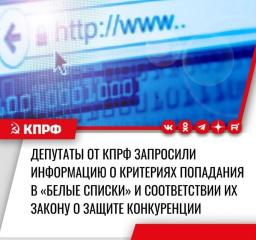 Группой депутатов Госдумы от КПРФ, включая избранных от Москвы С.П. Обухова и Д.А. Парфенова, направлено обращение с требованием разъяснить критерии попадания ресурсов в «белые списки» и рассмотреть риски монополизации при их создании. Об этом «СП» сообщили депутаты КПРФ Денис Парфенов и Александр Ющенко, рассказав об обращении к руководителю ФАС России Максиму Шаскольскому и синистру цифрового развития Максуту Шадаеву.