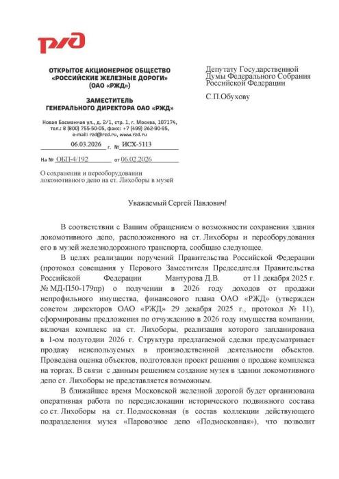 Депутатские запросы Сергея Обухова и многочисленные обращения активистов дали результат. Было принято решение, что «в ближайшее время Московской железной дорогой будет организована оперативная работа по передислокации исторического подвижного состава со станции Лихоборы на станцию Подмосковная (в состав коллекции действующего подразделения музея «Паровозное депо «Подмосковная»).