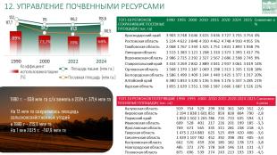 Всё, что связано с земельными ресурсами, считаю, что мы еще недостаточно эффективно работаем, и с точки зрения баланса плодородия почв изымаем сегодня почти всё то, что имели в 1991 году. При этом урожайность и объемы производства технической продукции не снизились, а внесение удобрений сократилось в три раза - с 10 миллионов тонн до 3,5 миллионов.