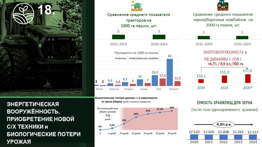 Представьте, увеличение площади севооборота на 10 миллионов гектаров эквивалентно 30 миллионам тонн продукции. Каждый миллион гектаров – это 3 тысячи комбайнов и 3 тысячи тракторов. Умножив это на 10, мы получаем 30 тысяч единиц техники, а это также влечет за собой необходимость развития складской инфраструктуры, сушильного оборудования, логистики и другой сопутствующей инфраструктурной системы. В первую очередь, в этом направлении должны предметно заниматься регионы и бизнес.