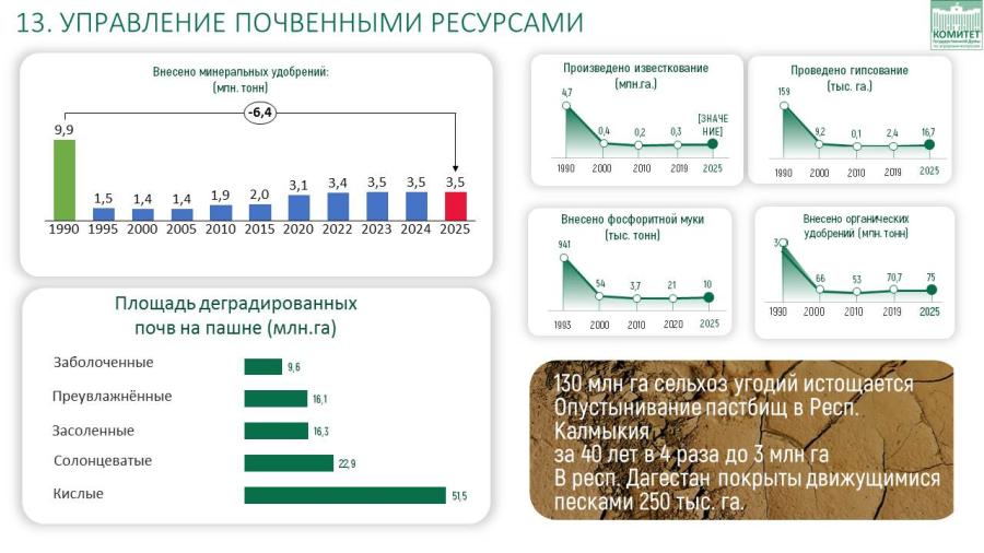 Например, внесение органических удобрений стало в пять раз меньше, (1990 г.- 390 млн тонн, 2025 г. – 75 млн тонн), а если взять внесение известковых удобрений - там вообще пропасть в 16 раз почти (если в 1990 г. известкование проведено на площади 4,7 млн га, то за последние 10 лет – на площади 0,3 млн га). Возникает актуальный вопрос, почему в регионах не уделяют этому вопросу должного внимания, и почему бизнес находится в стороне и не видит угрозы деградации земель? В России опустыниванием охвачено более 50 млн га в 27 регионах. В настоящее время 65% пашни, 28% сенокосов и 50% пастбищ России подвержены разрушающему, порой совместному, воздействию эрозии, дефляции, периодических засух, суховеев и пыльных бурь.