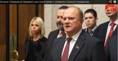17 сентября, предваряя заседание Государственной Думы, лидер КПРФ Г.А. Зюганов выступил перед журналистами с резким антиправительственным заявлением в связи с новыми попытками протащить через парламент законопроект, который ведет к разрушению Академии наук и накопленного за 300 лет потенциала академической науки страны. Ни один федеральный телеканал вечером 17 сентября даже не упомянул об этом важном заявлении лидера народно-патриотической оппозиции. КПРФ.ТВ предлагаем полную версия думского выступления Г.А.Зюганова.