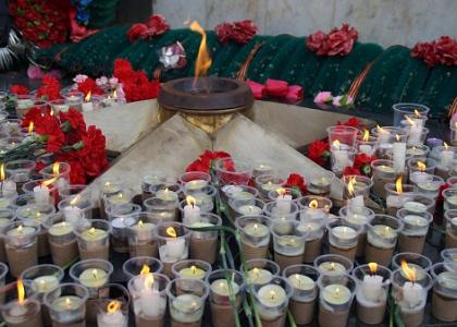 Под звуки реквиема к Мемориалу Победы возлагаются красные гвоздики и зажжённые свечи.