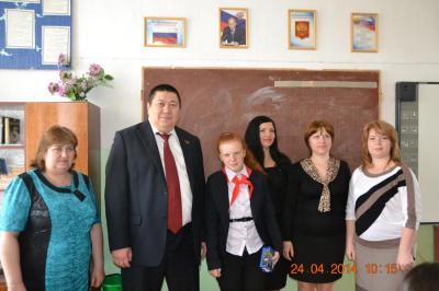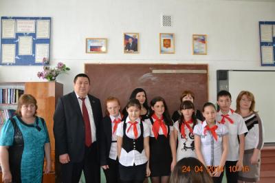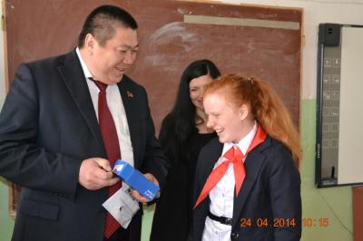 И на этот раз посетил ее по очень важному событию, поздравить ученицу 8 «Б» класса, председателя совета дружины, - Романенко Марину, которая участвовала в областном конкурсе «Лучший пионер года». За первое место, Евгений Шаманаев подарил ей современный сотовый телефон, на что Марина выразила огромную благодарность.