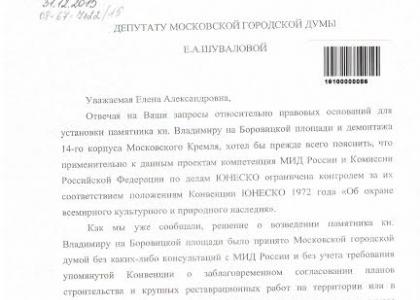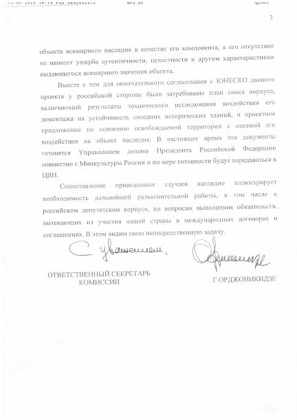 В адрес депутата фракции КПРФ в Мосгордуме Елены Шуваловой в ответ на её обращения к Генеральному директору ЮНЕСКО Ирине Боковой поступило письмо Ответственного секретаря комиссии РФ по делам ЮНЕСКО Григория Орджоникидзе.