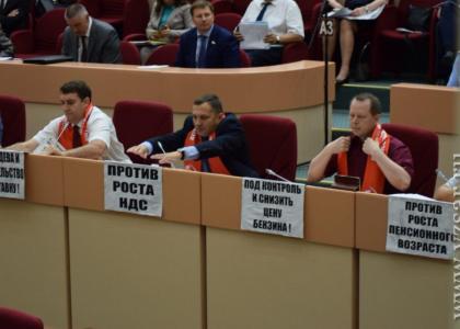 Каждое рабочее место депутата-коммуниста оформлено протестным лозунгом. Все депутаты явились на сессиях в красных шарфах КПРФ.