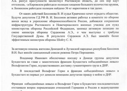 От каких действий Бессонова В.И. судья Кравченко хочет оградить общество? Будучи депутатом ГД РФ В.И. Бессонов активно работал в комитете по обороне, внося вклад в укрепление обороноспособности России, добивался сохранения инфраструктуры Ростовского и Новочеркасского военных училищ для нужд министерства обороны Российской Федерации, занимал активную позицию по смене министра обороны Сердюкова А.Э. о чем выступал с трибуны Государственной Думы. В результате Сердюков А.Э. был заменён более эффективным министром обороны Шойгу С.К.