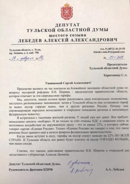 тарифы за вывоз мусора в Тульской области - председателя областного