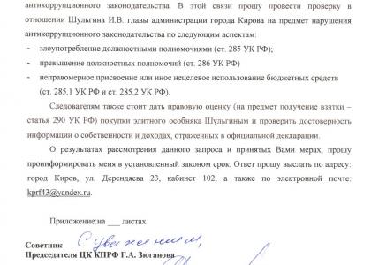 Руководитель фракции КПРФ в Законодательном Собрании Кировской области Сергей Мамаев направил официальные запросы в Генеральную прокуратуру и в Управление по противодействию коррупции Администрации президента России на предмет коррупционных нарушений со стороны сити-менеджера Кирова Ильи Шульгина.