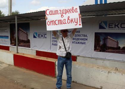 поднял плакат «Саитгареева в отставку!», но крепкие ребята оттеснили его,
