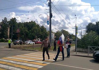 свой плакат, к ней подбежали трое неизвестных с российским флагом и такого же