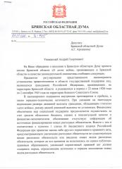 Депутат Брянской облдумы коммунист А.Г. Архицкий в качестве законодательной инициативы в очередной раз обратился к председателю облдумы В.И. Попкову с проектом закона Брянской области «О детях войны, проживающих в Брянской области». И вновь, как и следовало ожидать, получил отказ, подписанный 22.07.2020 г. и.о. председателя облдумы В.В. Беляем.
