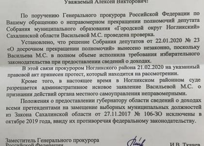 В дополнение отменим, что в настоящее время, в суде, по иску фракции КПРФ в собрании Ногликского городского округа рассматривается иск о признании незаконным решения Собрания об избрании председателя. Если бы, сейчас Сахалинский областной суд встал на строну КПРФ и Марины Васильевой, то это стало бы безусловным основанием для отмены судом и решения об избрании председателя Ногликского Собрания.