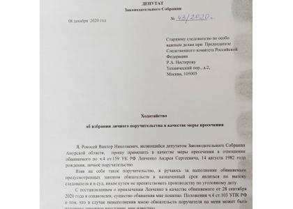 Амурские парламентарии-коммунисты попросили применить в качестве меры пресечения в отношении Андрея Левченко личное поручительство. Ходатайство на имя старшего следователя по особо важным делам при Председателе Следственного комитета Российской Федерации Р. А. Нестерову направили первый секретарь Амурского обкома КПРФ и руководитель депутатской фракции областного законодательного органа власти Роман Кобызов, а также его товарищи и коллеги по парламентской деятельности Ольга Лазаренко и Владимир Рокосей.