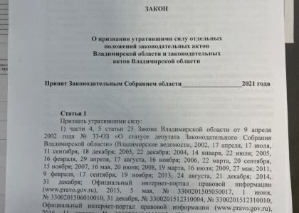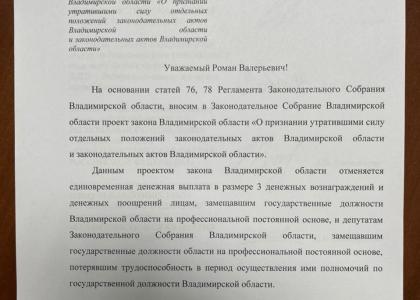 На декабрьской сессии заместитель председателя Законодательного Собрания Владимирской области Антон Сидорко предложил всем фракциям совместно разработать законопроект об отмене так называемых «золотых парашютов» для всех депутатов и чиновников, независимо от должности и стажа.