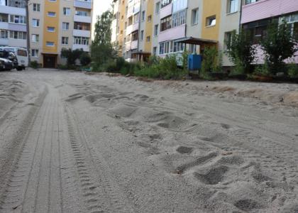 На месте депутаты обнаружили горы спиленных деревьев, щебень, остатки старого асфальта. Дорога засыпана песком, передвигаться по которому достаточно проблематично, особенно для родителей с колясками.