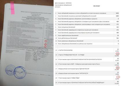 На избирательном участке №1804 (школа №2 г. Тобольска), согласно копии протокола, выданной наблюдателю, партия «Новые люди» набрала 74 голоса, а «Единая Россия» - 337 голосов, однако в ГАС «Выборы» внесено 4 голоса за «Новых людей» (минус 70) и 407 – за «Единую Россию» (плюс 70).