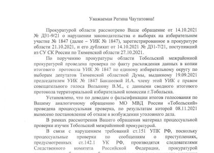 «Установлено, что по доводам о фальсификации итогов голосования… МО МВД России «Тобольский» проведена процессуальная проверка, по результатам которой вынесено постановление об отказе в возбуждении уголовного дела», - говорится в ответе за подписью заместителя прокурора области Александра Чернышева.