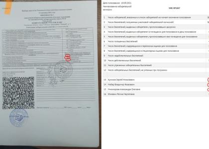 Аналогичная ситуация по данному участку была и с одномандатным округом. Наблюдателю от КПРФ выдали протокол, согласно которому кандидат от ЛДПР Сергей Куликов набрал 88 голосов, единоросс Владимир Майер – 308 голосов, а Александра Никонорова, представляющая «Справедливую Россию» - 35 голосов. В ГАС «Выборы» внесено 203 голоса за Куликова (плюс 115), 208 голосов за Майера (минус 100) и 20 голосов за Никонорову (минус 20).