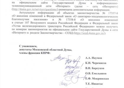 Сообщаем, что позиция заявителей, обратившихся в Мособлдуму, учтена и высказана на заседании Думы. Фракция КПРФ в Московской областной Думе вместе с другими оппозиционными фракциями голосовала против поддержки проекта федерального закона №17357-8 при рассмотрении его согласования в Московской областной Думе на заседании 25 ноября 2021 года. Тем не менее, большинством голосов было принято другое решение – о поддержке проекта №17357-8. Голоса разделились следующим образом: «за» проект постановления проголосовали 32 депутата, «против» – 10, воздержались – 2.