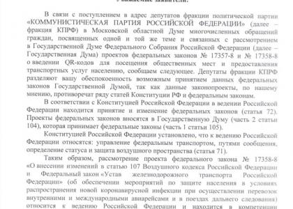В связи с поступлением в адрес депутатов фракции политической партии «КОММУНИСТИЧЕСКАЯ ПАРТИЯ РОССИЙСКОЙ ФЕДЕРАЦИИ» (далее – фракция КПРФ) в Московской областной Думе многочисленных обращений граждан, посвященных одной и той же теме и связанных с рассмотрением в Государственной Думе Федерального Собрания Российской Федерации (далее – Государственная Дума) проектов федеральных законов №17357-8 и №17358-8 о введении QR-кодов для посещения общественных мест и предоставления транспортных услуг населению, сообщаем следующее. Депутаты фракции КПРФ разделяют вашу обеспокоенность возможным принятием данных федеральных законов Государственной Думой, так как данные законопроекты, по нашему мнению, противоречат ряду статей Конституции РФ и федеральным законам.