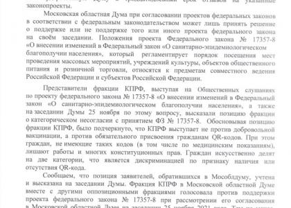 Представители фракции КПРФ, выступая на Общественных слушаниях по проекту федерального закона №17357-8 «О внесении изменений в Федеральный закон «О санитарно-эпидемиологическом благополучии населения», а также на заседании Думы 25 ноября по этому вопросу, высказали позицию фракции о категорическом несогласии с принятием ФЗ №17357-8. Обосновывая позицию фракции КПРФ, было подчеркнуто, что КПРФ выступает не против добровольной вакцинации, а против обязательного присвоения гражданам QR-кодов. При этом граждан, не имеющие таких кодов (в том числе по медицинским показаниям), лишают работы и многих конституционных прав. Граждан искусственно делят на две категории, что является дискриминацией по признаку наличия или отсутствия QR-кода.