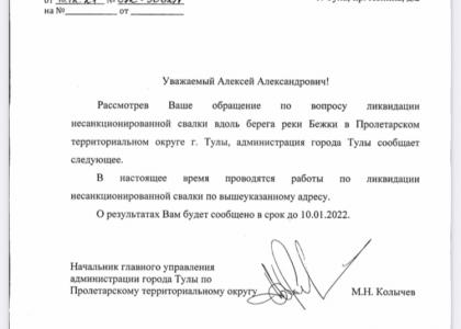 После обращения депутата Тульской городской Думы Алексея Лебедева администрация обязалась ликвидировать свалку на берегу реки Бежки в Пролетарском округе Тулы.