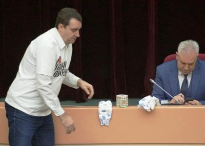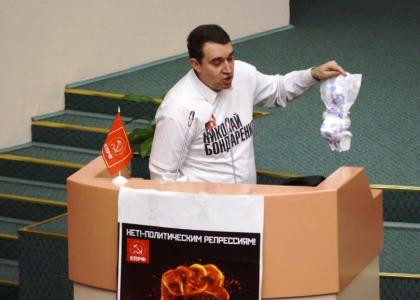 Глава фракции КПРФ Александр Анидалов вручил вице-спикеру Саратовской областной думы Антонову памперс и рулон туалетной бумаги, намекая на тот первобытный ужас и ненависть, которые испытывают члены медвежьей партии в отношении народного депутата.