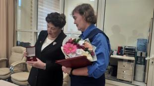 После окончания урока мы прошли в кабинет директора, где нас ожидали завуч школы Ольга Алексеевна Лекарева и учитель биологии Виктория Леонидовна Семенова. Почетную грамоту Тюменской областной думы и нагрудный знак ей вручила депутат Т.Н. Казанцева.