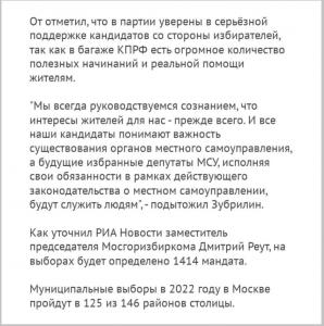 Мы уверены в серьёзной поддержке наших кандидатов со стороны избирателей, в нашем багаже огромное количество полезных начинаний и реальной помощи жителям. Есть несколько законов, касающихся местного самоуправления, которые мы внесли, и сегодня они работают, придавая органам местного самоуправления больше возможностей в части борьбы с коррупцией. Поэтому КПРФ понимает всю ответственность и важность участия в жизни районов нашего города. Мы всегда руководствуемся сознанием, что интересы жителей для нас - прежде всего! И все наши кандидаты понимают важность существования органов местного самоуправления, а, будущие избранные депутаты МСУ, исполняя свои обязанности в рамках действующего законодательства о местном самоуправлении, будут служить людям!