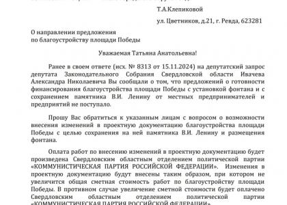 В конце прошлого года зампред Свердловского Заксобрания, первый секретарь Свердловского обкома КПРФ Александр Ивачёв официально обратился к администрации Ревды с предложением оплатить за счёт партии изменение проекта реконструкции площади Победы так, чтобы на ней разместились и памятник Ленину, и фонтан, который так хочет глава города. В своем письме представитель КПРФ отдельно попросили дать аргументированный ответ на партийную инициативу.