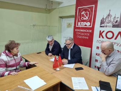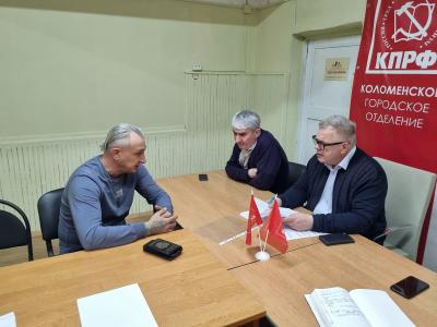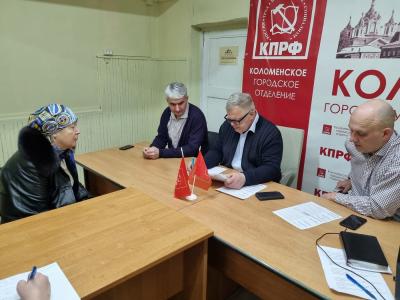 Руководитель фракции КПРФ в Мособлдуме Александр Наумов провел прием граждан в Коломне. Вместе с депутатом в приеме приняли участие: первый секретарь Коломенского ГК КПРФ, советник фракции КПРФ Сергей Стрельцов, руководитель аппарата фракции КПРФ в Мособлдуме Константин Елисеев и помощник депутата Мособлдумы Владимир Ионов.