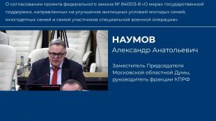 Зампредседателя Мособлдумы - руководитель фракции КПРФ в Мособлдуме Александр Наумов выступил на 131 заседании регионального парламента по вопросу согласования проекта федерального закона «О мерах государственной поддержки, направленных на улучшение жилищных условий молодых семей, многодетных семей и семей участников специальной военной операции», внесенного депутатом фракции КПРФ в Государственной Думе ФС РФ Ниной Останиной.