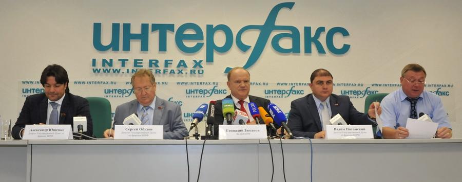 27 августа в ИА «Интерфакс» состоялась пресс-конференция Председателя ЦК КПРФ Г.А. Зюганова. В ней также приняли участие секретарь ЦК КПРФ, член Президиума, депутат Госдумы С.П. Обухов, кандидат в губернаторы Брянской области, депутат Госдумы В.В. Потомский и депутат Госдумы А.А. Ющенко. Г.А. Зюганов представил семь тезисов повестки дня нового политического сезона.