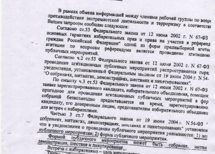Ответ прокуратуры был сведен к тому, что встреча с избирателем является целью публичного мероприятия, а не его формой, поэтому речь может идти только о собрании, митинге, демонстрации и пикетировании, проводимых с целью встречи с избирателями. А если речь идет об этих мероприятиях (собрания, митинги и т.д.), то они должны согласовываться в порядке, установленном законом 2004 года.