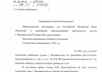 На имя депутата Госдумы фракции КПРФ А.В. Корниенко пришел ответ на его обращение от заместителя Министра МВД России Ю.Ф. Алексеева. Замминистра проинформировал депутата о наличии судимости за преступные деяния, которые можно отнести к разряду тяжких или особо тяжких преступлений, у кандидата в депутаты городской Думы города Владивостока от «Единой России» П.Н. Гетмана.