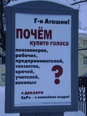 На днях в городе Ижевске по улице Пушкинской (в районе Центральной площади) был замечен необычный баннер с надписью «Г-н Агашин, почем купите голоса?». Напомним, что г-н Агашин – это тот самый оскандалившийся сити-менеджер Ижевска, который в открытую подкупал активистов ветеранского движения, ролик с записью этого попал в Интернет. Но вот только подобная правда не устраивает действующую власть и поэтому баннер, как неожиданно для всех появился, так же неожиданно исчез.