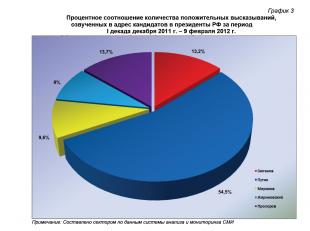 Итоговое процентное соотношение количества положительных высказываний, озвученных в адрес кандидатов на пост президента РФ за период 20 декабря по 9 февраля, составило: 54,5% от суммарного ИИБ – за В.В.Путиным, 13,7% - за М.Д.Прохоровым, 13,2% - за Г.А.Зюгановым, 9,6% - за С.М.Мироновым и 9% - за В.В.Жириновским (график 3).