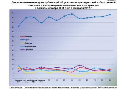 Динамический ряд, отражающий порядок наполнения медиа-потока публикациями о деятельности претендентов на главный государственный пост в Российской Федерации за период с 20 декабря 2011 г. по 9 февраля 2012 г. (график 1), позволяет заключить, что 9 февраля доля присутствия в информационном пространстве В.В.Путина достигла максимального, В.В.Жириновского и М.Д.Прохорова – близкого к минимальному, а Г.А.Зюганова и С.М.Миронова – к среднему за анализируемый период уровню.