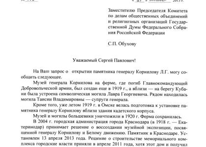 13 апреля в Краснодаре состоялось открытие памятника генералу от инфантерии Л. Г. Корнилову по случаю 95-й годовщины со дня его гибели. Правда, организаторы церемонии сообщили, что памятник еще не полностью готов. Помимо открытой обозрению статуи генерала возле него будут воздвигнуты еще три конные фигуры из бронзы. По мысли авторов проекта, эти кони должны символизировать "потерянную армию и трагическую судьбу всего белого движения". Можно подумать, что генерал Корнилов вел за собой не войско, а конское стадо. Не понятно также: с каких пор три коня стали символом трагизма и почему эти копытные должны олицетворять провал белого движения?