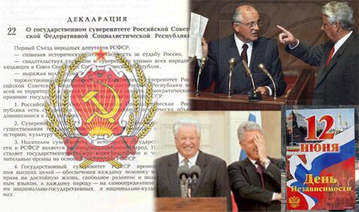 Мне, свидетелю этих событий в Кремле, как работнику Президиума Верховного Совета РСФСР приходилось заниматься обеспечением работы Первого съезда народных депутатов РСФСР. Довелось в те дни услышать от самих депутатов немало остроумных определений по поводу этого «Дня независимости». Нередко даже представители радикал-демократических сил подшучивали: «Это день независимости Бориса Николаевича от Михаила Сергеевича». И в этой шутке лишь доля шутки, так как само избрание Ельцина Председателем Верховного Совета РСФСР стало возможным лишь после личного вмешательства Горбачева в выборный процесс: многие представители среднего партийно-советского звена после горбачевской агитации, действуя по известному принципу «назло бабушке отморожу уши», проголосовали за Ельцина. Ну а дальше неумолимая логика политического процесса толкала «депутатское болото», примкнувшее к «Демократической России», к дальнейшим разрушительным шагам, инициированным «демороссами».