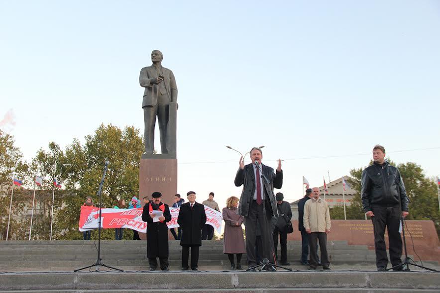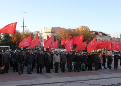 Советского Союза, флагами КПРФ, ЛКСМ РФ и праздничными транспарантами, среди