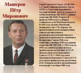 Исполнилось 100 лет со дня рождения Петра Мироновича Машерова, выдающегося политического деятеля советской эпохи, руководителя Коммунистической партии Белоруссии. Вся его легендарная жизнь была отдана созиданию и развитию социалистического общества, утверждению его гуманистических идеалов. Отмеченный двумя высшими государственными званиями — Героя Советского Союза и Героя Социалистического Труда, он стал поистине народным героем.