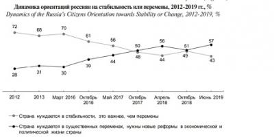А вот данные академической науки - ИСИ РАН: С марта 2016 г. по июнь 2019 г. доля желающих перемен выросла с 30 до 57%. А среди россиян в возрасте 18-30 лет - 62%, студентов вузов - 75% . Далее идут инженерно-техническая интеллигенция (56%), рабочие (55%), бюджетники (врачи, учителя, работники культуры – 52%). Меньше всего хотят перемен - политики, чиновники, сотрудники силовых структур, священнослужители (от 1 до 9%).