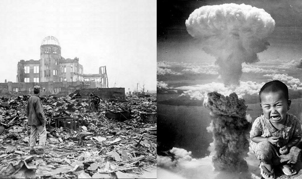 Утром 6 августа 1945 года американский бомбардировщик B-29 «Enola Gay» сбросил на японский город Хиросима атомную бомбу «Little Boy» («Малыш») эквивалентом от 13 до 18 килотонн тротила. Три дня спустя, 9 августа 1945, атомная бомба «Fat Man» («Толстяк») была сброшена на город Нагасаки. Общее количество погибших составило от 90 до 166 тысяч человек в Хиросиме и от 60 до 80 тысяч человек — в Нагасаки.