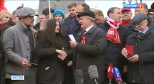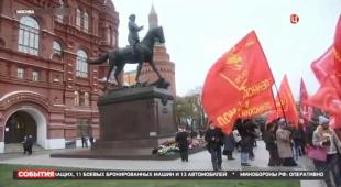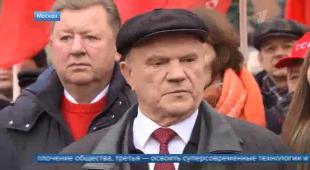 «Сегодня же исполнилось 105 лет Октябрьской революции. События осени 1917-го эксперты и историки оценивают по-разному: переломный момент, переворот. Представители КПРФ эту дату отмечают каждый год. Вот и сегодня по традиции они организовали акцию в центре Москвы. В митинге принял участие и лидер партии Геннадий Зюганов. Говорил в том числе о событиях наших дней. По мнению Зюганова, есть два варианта, как может развиваться ситуация дальше.