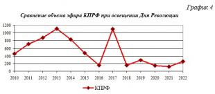 В 2022 г. возрос уровень освещения митингов КПРФ в День Революции. Эфирное время Компартии в 2022 г. увеличилось в два раза по сравнению с 2021 годом, однако не достигло уровня 2019 года.